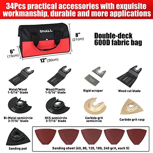 SHALL Outil oscillant 500 W multifonction oscillant avec angle d’oscillation de 5°, 6 vitesses variables, poignée auxiliaire, 34 accessoires de scie et sac de transport,Prise européenne
