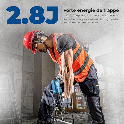 Performances supérieures : le marteau perforateur est équipé d’un moteur de 800 watts et d’une énergie de frappe de 2,8 j pour des performances de perçage maximales. Capacité de perçage : 26 mm, vitesse à vide : 0-1200 tr/min, fréquence d’impact nominale : 0-4000 BPM.