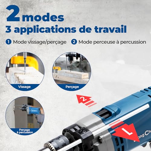 【Travail très efficace】Mandrin à clé de 13 mm entièrement métallique pour le changement d’embout et la rétention. Poignée anti-vibrations avec poignée auxiliaire à 360° et barre de profondeur augmente la contrôlabilité et la stabilité. Grande gâchette verrouillable avec régulateur de vitesse variable optimise la précision de perçage et réduit la fatigue. Le cordon d’alimentation de 2,6 m permet de manœuvrer dans une plus grande zone de travail.