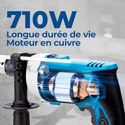 【Moteur puissant】Moteur robuste en cuivre de 710W qui fournit jusqu’à 3000 tours à vide et 0-45,000 BPM, optimise la durabilité et la performance. Sélecteur de mode double:perçage et marteau perforateur pour une grande variété d’applications de bois, d’acier et de maçonnerie
