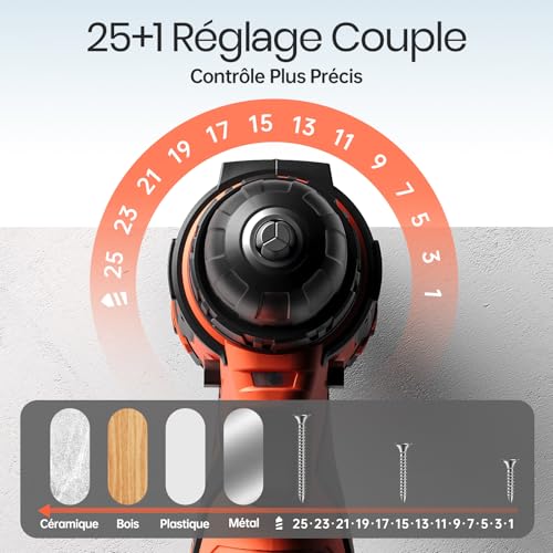 Petite mais puissante visseuse sans fil: 25NM de couple, 25+1 réglages de couple, transmission à deux vitesses, basse vitesse (0-450 tr/min), haute vitesse (0-1400 tr/min), vous pouvez l’adapter de manière flexible à vos besoins réels; Que ce soit un travail léger ou un travail de haute intensité, elle peut y faire face.