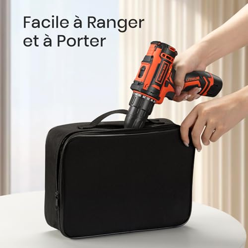 Portable et rangeable: Portable et stockable, la perceuse visseuse sans fil à batterie 12V est associée à un sac en tissu noir. Où que vous soyez, vous pouvez facilement ranger cette perceuse visseuse sans fil dans le sac portable associé à tout moment, ce qui est pratique pour l’emmener partout avec vous pour vous aider. Le sac est sale et résistant à l’usure. Rangez la perceuse dans le sac en tissu après utilisation, évitez de confondre vos outils, protégez-les des dommages et prolongez leur durée de vie.