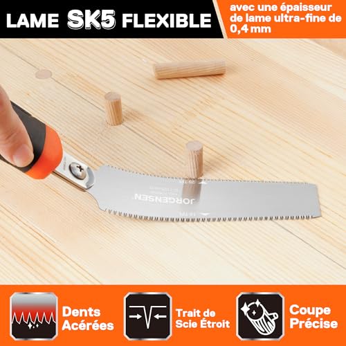 Lame SK5 durable: Notre scie est équipée d’une lame SK5 de première qualité d’une épaisseur de 0,4 mm, qui permet d’obtenir d’excellentes coupes précises avec un minimum d’effort. En outre, les dents acérées uniques et la coupe étroite augmentent considérablement l’efficacité. Elle est parfaite pour façonner le bois avec précision et réaliser des assemblages de meubles