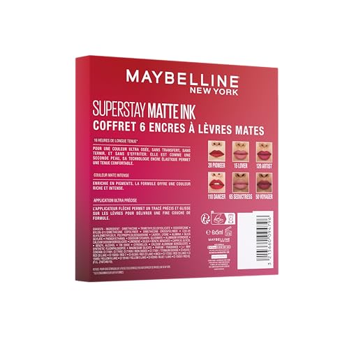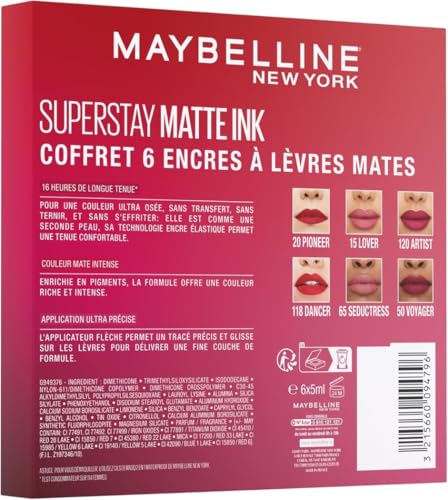 Spécification: Maybelline New York – Coffret Exclusif de 6 Rouges à Lèvres Liquides Longue Tenue – Superstay Matte Ink – Teintes: Lover (15)/Seductress (65)/Artist (120)/Dancer (118)/Pioneer (20)/Voyager (50)