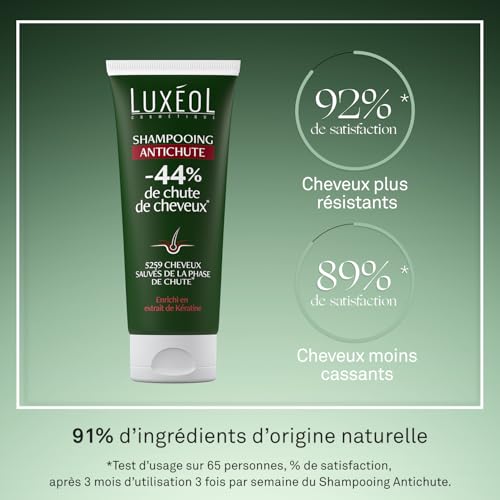 POUVOIR ANTICHUTE : Fragilisés, vos cheveux ont tendance à tomber ? Dites stop à la perte de cheveux ! Luxéol Shampooing Antichute vous aide à conserver une chevelure garnie en réduisant la chute des cheveux de 42 %*. Un véritable allié capillaire