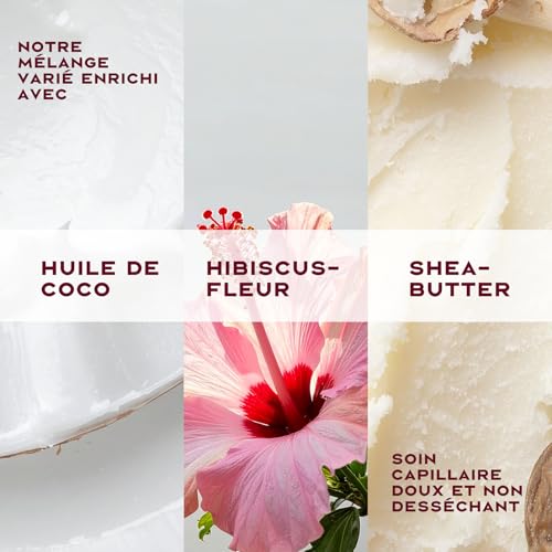 Le shampooing est enrichi avec de l’hibiscus, des huiles de noix de coco et de neem et de la protéine de soie