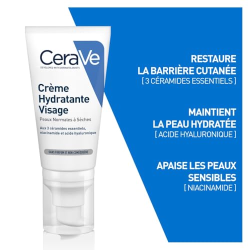 CeraVe – Crème Hydratante Visage – Hydrate 24h, Apaise & Répare – Diffusion Prolongée des Actifs – 3 Céramides Essentiels, Niacinamide, Acide Hyaluronique – Peau Normale à Sèche – 2 x 52 ml