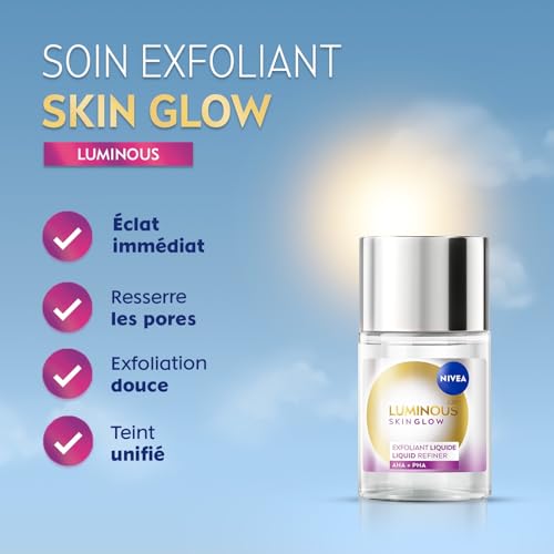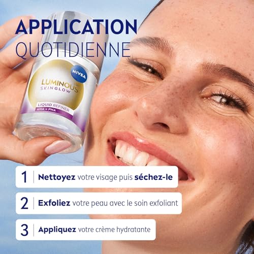 Depuis plus de 100 ans, NIVEA s’engage à répondre aux besoins spécifiques de chaque type de peau. Au cœur de l’un des plus grands centres de recherches européens, nous développons des soins efficaces, à la sensorialité unique. Nous connaissons votre peau et en prenons soin au quotidien, pour que vous vous sentiez bien.Au-delà de la peau, nous prenons à cœur notre responsabilité envers la planète. Dans un monde où la peau est votre lien direct avec la nature, nous nous engageons à élaborer des produits plus respectueux de l’environnement, en réduisant notre empreinte carbone. Chez NIVEA, nous savons que vous ne pourrez avoir une belle peau que dans un monde plus sain.One Skin. One Planet. One Care.À la recherche d’un soin visage qui exfolie en douceur tout en boostant instantanément le glow de votre peau ?Le Liquid Refiner Skin Glow NIVEA Luminous 630 est la solution idéale pour lisser, unifier et illuminer le teint jour après jour. Sa formule innovante associe 4 % d’AHA pour stimuler le renouvellement cellulaire, 1 % de PHA pour une exfoliation douce, et de l’aloe vera pour une hydratation immédiate. Légère et rapidement absorbée, cette lotion perfectrice affine visiblement les pores, réduit l’apparence des taches et révèle une peau plus lumineuse dès 7 jours. Utilisé seul ou en duo avec le Sérum Skin Glow de la même gamme, il offre une routine complète pour corriger les irrégularités, lisser la texture de peau et raviver son éclat naturel, tout en douceur.