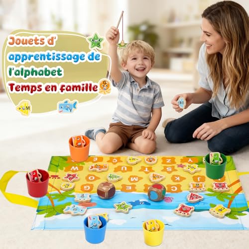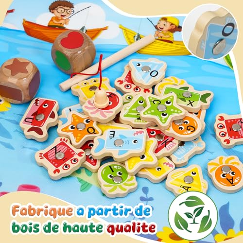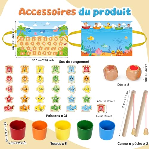 Peche a la Ligne Enfant:Ce jeu de pêche aux animaux marins est le idéal jouet enfant 2 3 ans, parfait pour le divertissement quotidien ! Ce jeux montessori en bois comprend 31 mignons animaux marins( français), 5 tasses à empiler, 2 cannes à pêche, 2 dés et une tapis de jeu (avec fonction de sac à rangement). Les enfants apprennent à reconnaître les couleurs et les lettres par le jeu, tout en développant efficacement leurs mouvements fins et leurs capacités de résolution de problèmes.