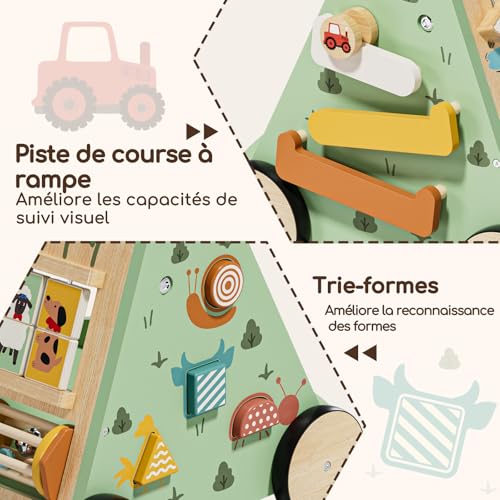 Jouet d’activité et de développement 10-en-1 évolutif: De ses premiers pas aux moments de jeu plus concentrés, ce baby walker se transforme en un véritable centre d’activités sensorielles. Il comprend 10 éléments ludiques : miroir sécurisé pour bébé, perles roulantes colorées, engrenages fleurs, labyrinthe canard, trieur de formes, porte de ferme, puzzle animaux, circuit tracteur et tambour rotatif. Ces jouets d’activité et de développement stimulent la motricité fine, la coordination œil-main et le développement cognitif précoce.