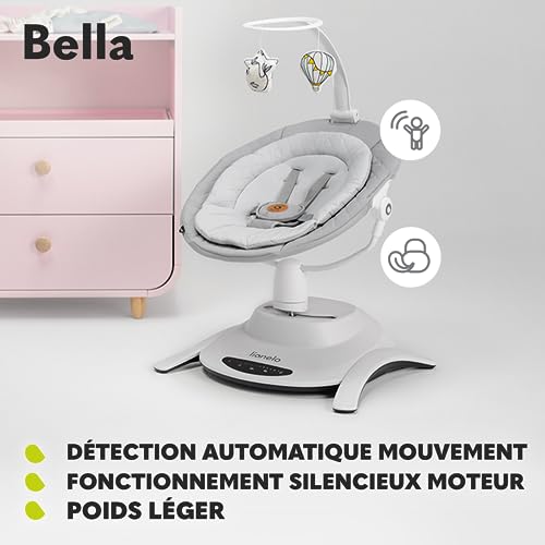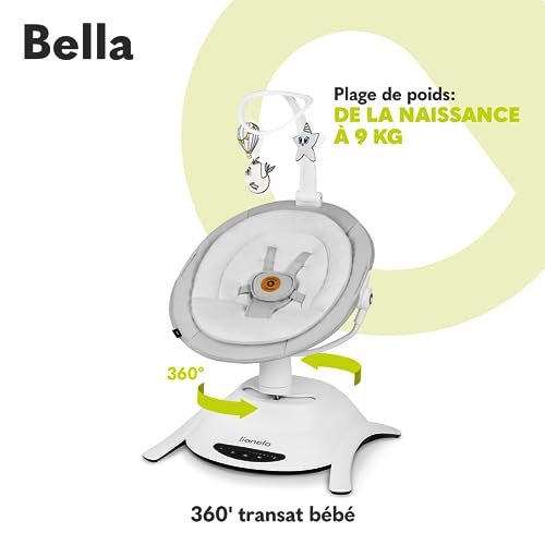 LIONELO Bella Balancelle Bebe Electrique Pivotante à 360° pour les Bébés jusqu’à 9 kg, Dossier Réglable, 5 Vitesses de Balancement, Ceintures de Sécurité, Détection de Mouvement, Antidérapante