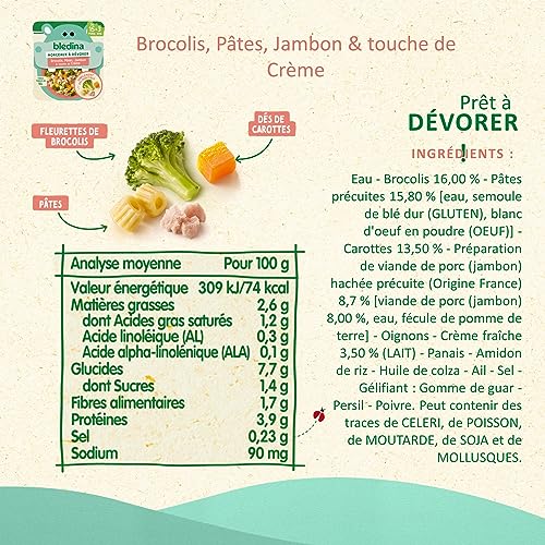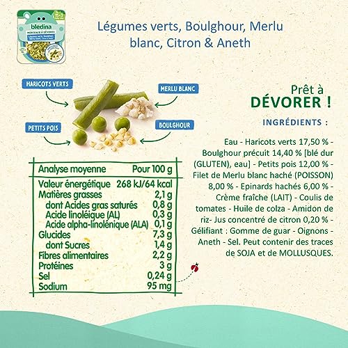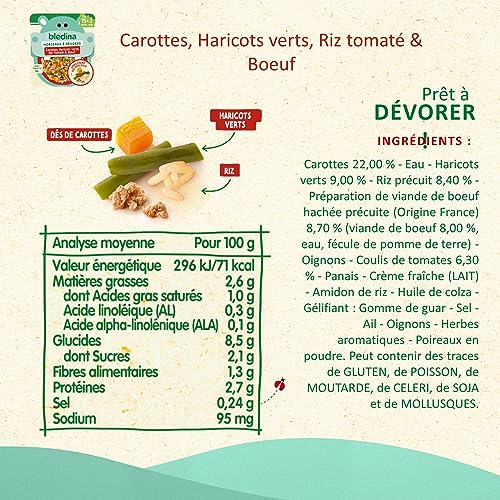 PETITS PLATS POUR GRANDS BEBES : Blédina a fait grandir son expertise du grand bébé avec des recettes développées par des pour une texture adaptée. Spécialement conçue pour apprendre à manger comme un grand : Une gamme de plats complets* pour le midi et pour le soir. *Pour un repas complet, ajoutez un filet d’un mélange d’huiles puis servez un Mini-Lacté et des petits morceaux de fruits fondants en dessert.