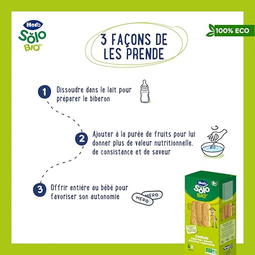 Découvrez l’excellence nutritionnelle avec les biscuits Hero Solo BIO Pack Biscuits. À base de céréales et de farine de blé complète, ces délicieux biscuits sont une source naturelle d’énergie pour votre enfant. Fabriqués à partir d’ingrédients 100 % naturels et biologiques, ces biscuits sont exempts d’huile de palme et d’additifs, ce qui garantit une alimentation saine et sûre dès l’âge de 8 mois. Notre engagement envers la qualité est indéniable, car nous suivons les normes rigoureuses de qualité Hero à chaque étape de la production. Chaque produit garantit l’excellence des ingrédients, l’équilibre nutritionnel et les contrôles de qualité, offrant ainsi une option alimentaire fiable à votre bébé. Avec les biscuits Hero Solo Bio, votre bébé ne reçoit que le meilleur : des ingrédients naturels et biologiques qui favorisent une croissance et un développement sûrs. Ces biscuits sont une option pratique lorsque vous êtes en déplacement, grâce à leur emballage facile à transporter qui s’adapte parfaitement à votre sac à main ou à votre sac à dos. Pour la conservation, nous recommandons de les garder dans un endroit frais et sec. Une fois ouverts, ils doivent être conservés dans une boîte hermétique pour préserver leur fraîcheur. Ces biscuits sont polyvalents et peuvent être dissous dans du lait pour obtenir une délicieuse bouillie de céréales ou ajoutés à une purée de fruits pour augmenter leur valeur nutritionnelle. Le fait de les proposer entiers favorise également l’autonomie de votre bébé pendant l’alimentation.