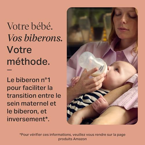 Avec notre biberon primé Closer to Nature®, la transition entre l’allaitement maternel et le biberon n’a jamais été aussi simple. En fait, avec une acceptation garantie* et une valve anti-colique intégrée, il pourrait bien être la meilleure chose pour bébé, depuis vous ! Inspiré par maman, conçu par des experts La tétine a une forme imitant le sein maternel pour une prise en bouche naturelle. Elle a été conçue avec des experts de l’allaitement maternelle pour imiter la souplesse et l’élasticité du mamelon maternel. Fabriquée en silicone super doux, la tétine offre la même sensation qu’au sein pour un confort optimal durant la tétée. La valve sensible et au large goulot du biberon stimulent l’action tétée intuitive de votre bébé. La forme compacte permet au bébé de s’alimenter dans une position naturelle, en étant plus proche de vous.Les biberons Tommee Tippee Closer to Nature® sont disponibles dans une large gamme de tailles, de couleurs et de décorations. Les tétines sont également disponibles dans une variété de débits différents, de sorte que le lait puisse couler plus rapidement lorsque votre bébé a faim !Le biberon à large col facilite le nettoyage et les biberons peuvent passer au lave-vaisselle, au micro-ondes ainsi qu’au stérilisateur à vapeur. Il suffit de dévisser votre biberon en trois parties pour le nettoyer et le stériliser facilement.Toutes les biberons Tommee Tippee sont sans BPA et phtalate pour une sécurité alimentaire accrue. * La tester c’est l’approuver – Parmi plus de 1 200 parents ayant utilisé notre tétine avec leur enfant, 92 % ont affirmé qu’il l’avait accepté lors des 3 premiers essais.** Recommandé par les mamans – Lors d’une enquête en ligne en 2012 interrogeant plus de 500 mamans ayant utilisé les biberons Closer to Nature, 97 % d’entre elles ont affirmé qu’elles recommanderaient les biberons Closer to Nature à d’autres mamans.