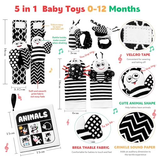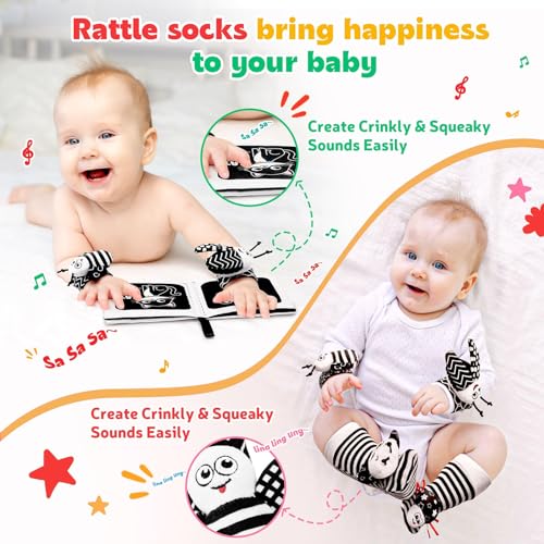 Hebterrka Jouet hochet pour bébé de 0 à 12 mois, chaussettes et hochet de poignet, jouet pour bébé contrasté pour nouveau-né, livres