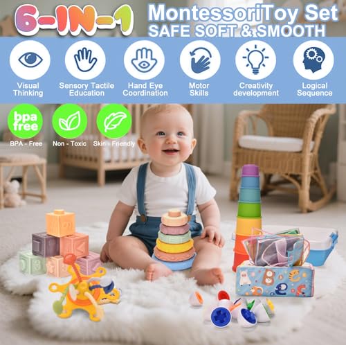 Jouet BéBé pour 6 à 12 Mois,Jeux Bébé Eveil 1 an,Montessori Jouet Eveil 9-18 Mois,Empilable Sensoriel 6 en 1 Blocs de Construction,Boite de Mouchoirs en Papier,Cadeau pour Bebe eveil 6-9-12-18Mois