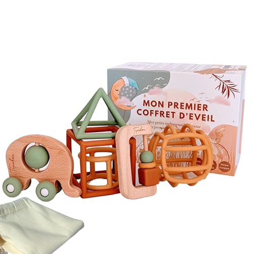Jouets d’éveil bébé 1er âge – Coffret naissance mixte montessori garçon et fille – 5 Jeux d’activité et de développement sensoriel bois et silicone, Balle, Formes, Hochet, Roues, 3 Mois>3 Ans