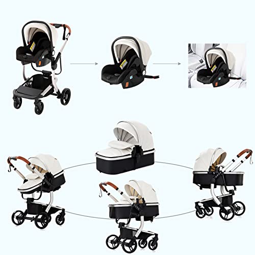 3 en 1 Poussette Combinée Poussette Canne Poussette Citadine Landau Poussette Système de Voyage pour Bébé Poussette Paysage Haute pour Bébé Inclinable Pliable Poussette Standard (518 White)