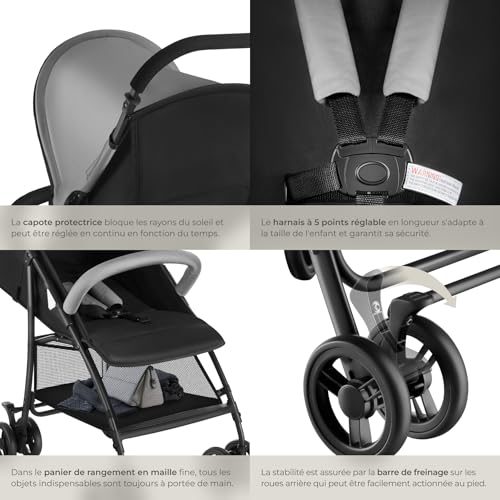 SÉCURITÉ OPTIMALE AVEC HARNAIS RÉGLABLE : La poussette est équipée d’un harnais à 5 points réglable en longueur, garantissant une sécurité maximale pour votre bébé. L’arceau de sécurité assure un maintien parfait, même lors de déplacements rapides. Ce modèle est conçu pour les bébés dès la naissance, et peut s’adapter à la croissance de votre enfant jusqu’à 36 mois. Parfaite pour les promenades en ville ou les vacances. Parfait aussi en cadeau de naissance?