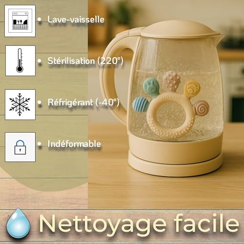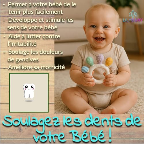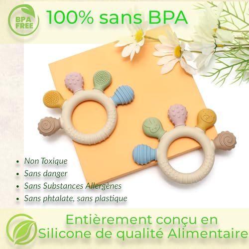 🔝🌱 Favorise le développement : Aide au soulagement des douleurs de dentition/gencive lors des premières poussées dentaires tout en encourageant l’exploration sensorielle et la motricité fine. Sans aucun risque le jouet peut être mis en bouche, mâché et mastiqué en toute sécurité par votre bébé.