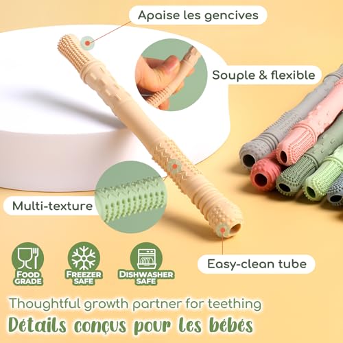 [ DURABLE & HYGIÉNIQUE ] — ❄️ Ces tubes de dentition sont conçus sans soudure et de forme creuse, permettant un nettoyage facile avec la petite brosse incluse. Ils peuvent être réfrigérés pour un apaisement accru, et stérilisés au micro-ondes ou au lave-vaisselle. Le matériau robuste supporte des températures de -50°C à 230°C.