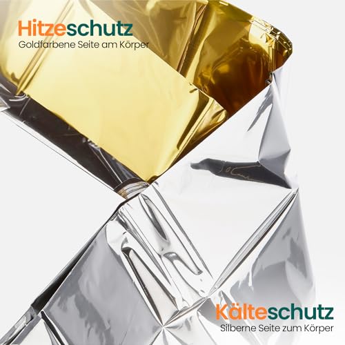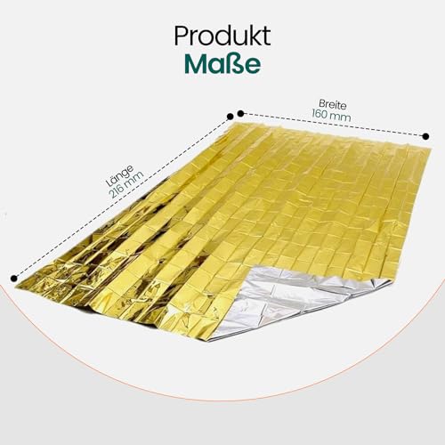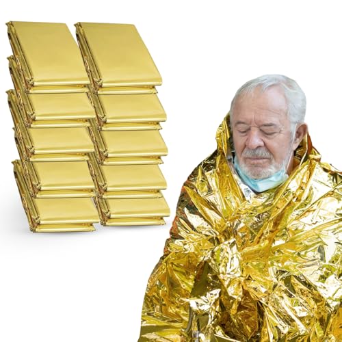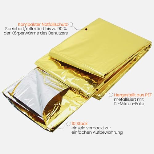Hygiene100 Lot de 10 couvertures thermiques d’urgence (210 x 160 cm) – Couverture spatiale en feuille d’or pour randonnée en plein air, équipement de premiers secours, équipement de camping,