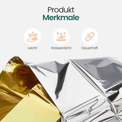 Ces couvertures d’urgence polyvalentes vous protègent des éléments dans toutes les situations : camping, randonnée, randonnée, cross country, trail running ou toute autre aventure en plein air. Le lot de 10 couvertures d’urgence est parfait pour votre équipement d’urgence dans la voiture pour vous aider au milieu de nulle part. Elles peuvent être utilisées comme couverture de sol, doublure de sac de couchage ou pour prévenir l’hypothermie et les chocs dans des conditions météorologiques extrêmement froides. L’aspect aluminium de ces couvertures renforce non seulement leurs propriétés réfléchissantes de la chaleur, mais les rend également bien visibles de loin. Cette visibilité peut être cruciale pour la signalisation de l’aide dans les situations d’urgence. Que vous soyez en camping, en randonnée dans la nature, que vous soyez en déplacement avec un sac à dos ou que vous participiez à une aventure en plein air, ces couvertures d’urgence sont un must. Elles contribuent de manière significative à la sécurité et à la préparation dans une nature imprévisible.