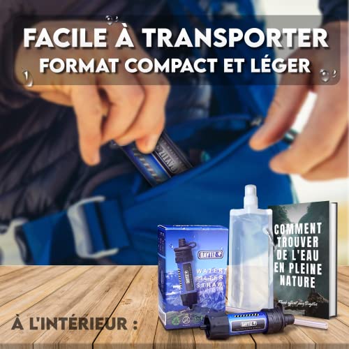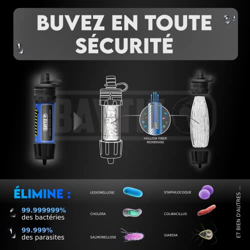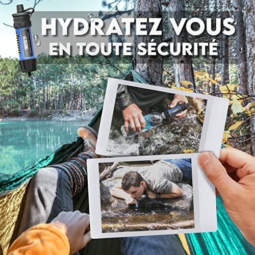 BAYTIZ ® Paille Filtrante de Survie + Gourde Souple – Purificateur d’Eau pour Randonnée Camping Bushcraft – Filtre à Eau de Poche, Materiel Militaire Accessoires Survivalisme Equipement Kit Voyage