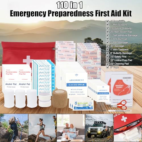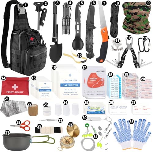 BILIPLE Kit de Survie 35 en 1, 134pcs Trousse de Survie Polyvalente avec Trousse de Secours, Couverture de Survie, Mini Pelle Pliante, Pince Multifonction, Lampe Torche, Sac à Bandoulière