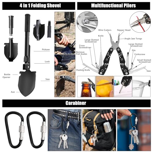 🏕️ 【Kit de survie d’urgence 35 en 1】134 articles au total, dont pince multifonction, pelle pliante, lampe de poche (piles non incluses), sifflet de survie, boussole, couverture de sauvetage, matériel de pêche, cordes, cuillère fourchette multifonctions, sac de rangement… Cet ensemble d’outils multifonction vous équipe pour tout défi pendant le camping, la randonnée ou l’exploration.