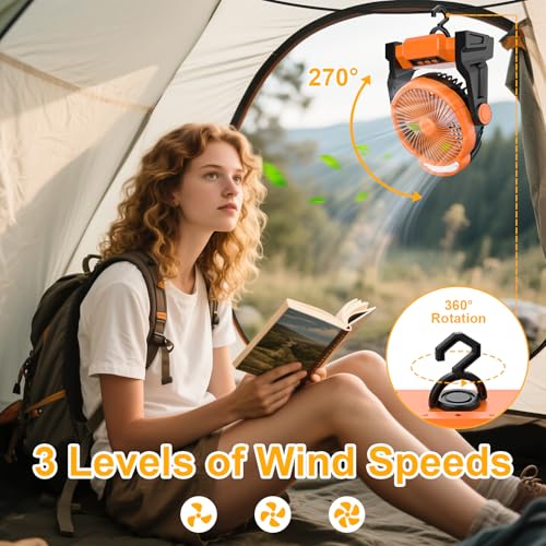 【3】Conception robuste : Avec un crochet et une poignée de suspension, vous pouvez l’accrocher à la tente ou le poser sur votre bureau. Le crochet peut être tourné à 360°. Le boîtier du ventilateur de camping est fabriqué en ABS robuste, qui peut résister à certains chocs et a une durée de vie relativement longue.