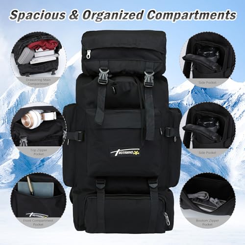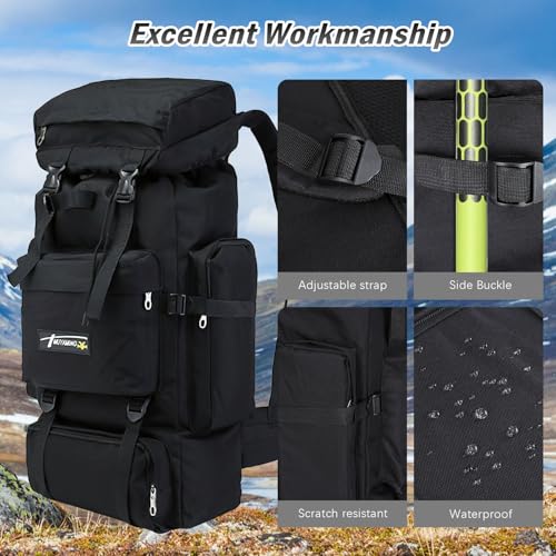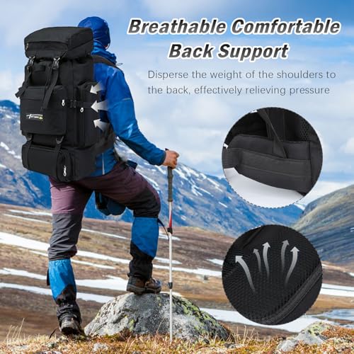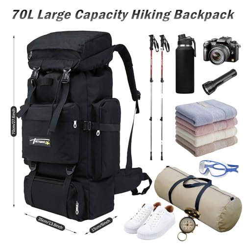 Sac à Dos de Randonnée 70 L, Camping Sac à Dos Imperméable Léger Sac de Voyage de Grande Capacité pour Homme Femme Réglable Durable pour Camping Randonnée Trekking Voyage Plein air, Noir, L