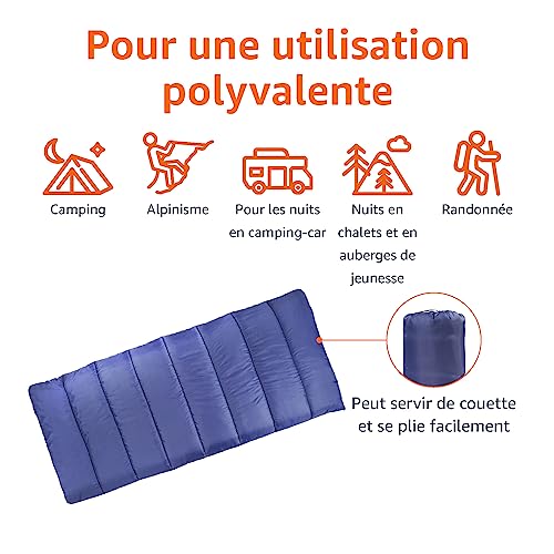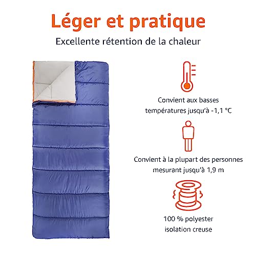 Amazon Basics Sac de couchage conçu pour températures basses, camping et randonnée, rectangulaire, bleu