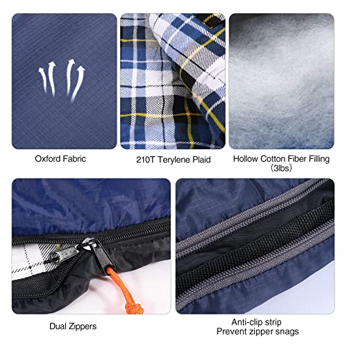 REDCAMP Flannel Sleeping Bag for Adults, Large Cotton Sleeping Bags for Camping with Detachable Hood, Blue Plaid with 3lbs Filling