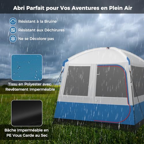Restez au Sec et Protégé : Equipez votre famille de notre tente de camping pour 5 personnes, un abri parfait contre les éléments, dotée d’un tissu en polyester de qualité supérieure avec un revêtement PU imperméable et d’un sol en bâche PE résistante. Cette tente protège du soleil et de la bruine, vous assurant de rester au sec et à l’aise à l’extérieur. (Remarque : de fortes pluies peuvent dépasser ses défenses.)
