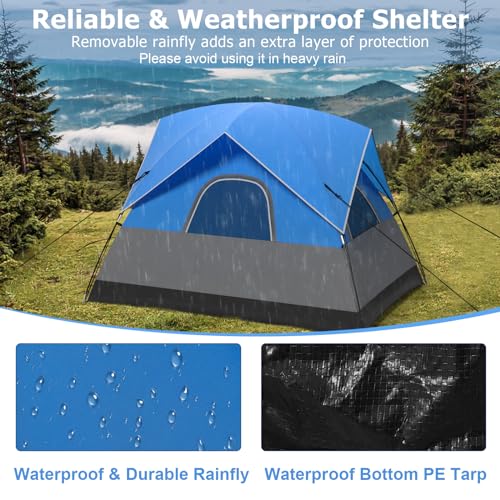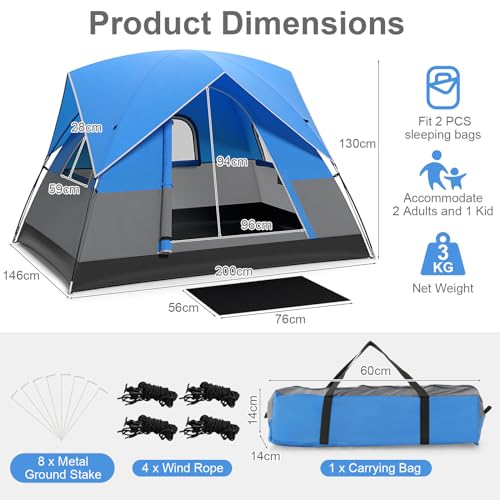 HOMASIS Tente de Camping pour 2-3 Personnes, Tente Dôme de Randonnée Imperméable avec 3 Fenêtres et Toit de Pluie, Tente Camping Légèr d’Extérieur avec 4 Cordes à Vent et 8 Piquets,200 x 146 x 130 cm