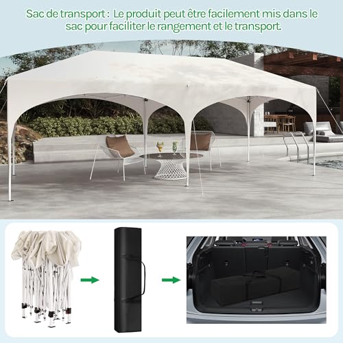 Application Multi-scènes & Rangement Portable : La tonnelle 3×6 convient au barbecue dans le jardin, au camping sur la plage, au mariage, au marché, etc. Vous pouvez la plier et la ranger dans le sac de transport de 117×35×20cm pour un déplacement facile. La tente de réception est livrée avec des accessoires complets, y compris le manuel