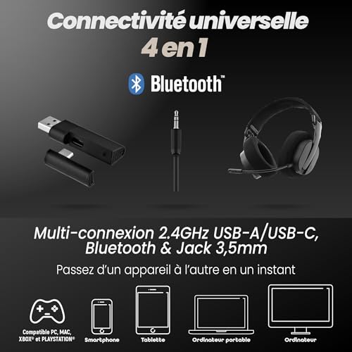 [Connectivité 4 En 1] Profitez d’une liberté totale grâce à sa connexion Bluetooth, ses dongles USB-A et USB-C, et sa prise Jack 3.5 mm. Passez facilement d’un PC à une console ou un smartphone sans déconnexion ni latence