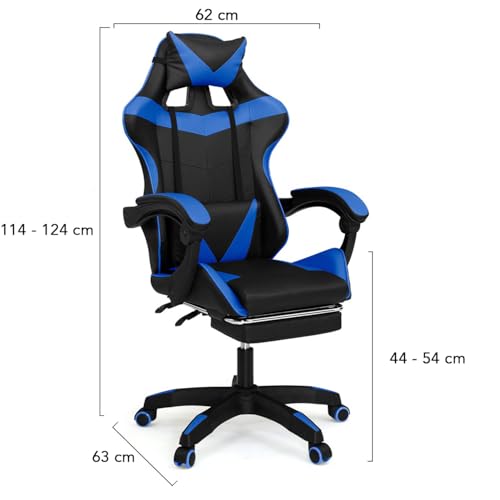IDMarket – Fauteuil de Gaming Alex réglable avec Repose-Pied, Coussin de tête et Coussin Lombaire Noir et Bleu