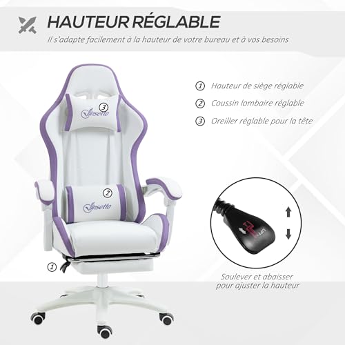 Vinsetto Chaise Gaming Fauteuil Gaming Ergonomique Repose-Pieds télescopique, Dossier inclinable à 135°, Appui-tête réglable et Soutien Lombaire, Fauteuil de Bureau 360° Rotatif en Similicuir, Blanc