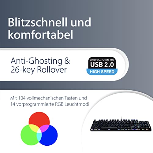 Model: Corded mechanical gaming-keyboard with 104 keys and 14 color modes Mechanical keyboard with 104 keys Anti-Ghosting with N-Key Rollover (26 keys) 14 RGB backlight color modes 12 Multimedia keys for direct access to applications Anti-slip rubber feets Stylish aluminium surface Connection: USB 2.0 Connection cable; 1.8m cable length Rating: DC 5V – 500mA (max.); USB bus-powered Compatible with Windows, Mac and Linux; Plug & Play Splash-proof; Win-Lock function Durability: More than 50.000.000 keystrokes Color: black/silver Dimensions: 437 x 128 x 36mm Weight: ± 850g