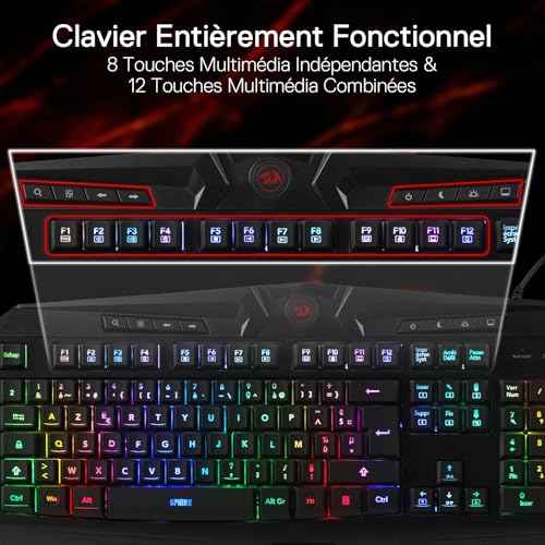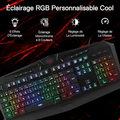 Redragon K503 AZERTY Clavier de Jeu Filiaire, Rétroéclairage LED RGB, Touches Multimédia, Clavier à Membrane Silencieux avec Repose-Poignet pour PC Windows (Noir)