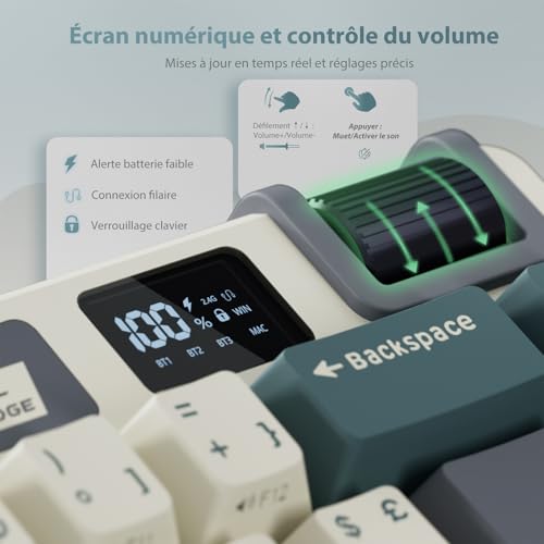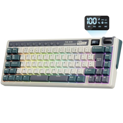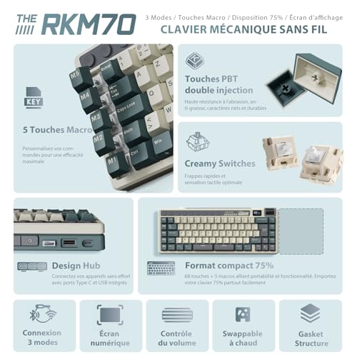 RK ROYAL KLUDGE M70 Clavier Mécanique 75% sans Fil – Triple Connexion, 5 Macros Programmables, Écran État, Molette Verticale, Switches Creamy Tactiles Hot-Swap, AZERTY Français, Batterie 6000mAh