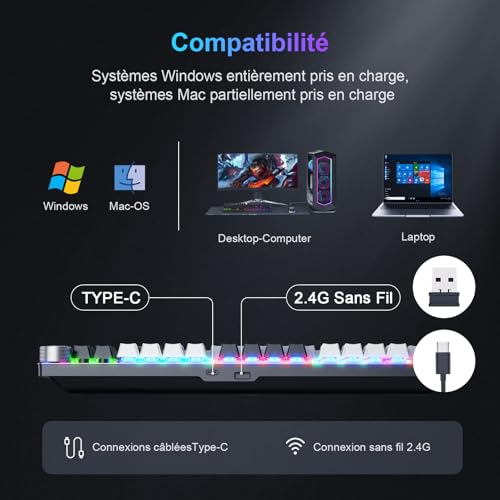 Clavier Gaming: Clavier Gamer mécanique dispose de deux méthodes de connexion, l’une via un dongle sans fil 2,4G et l’autre via une connexion USB-C filaire, conexión Bluetooth no compatible. Compatible avec Windows pour PC/PS4/Xbox/Ordinateurs
