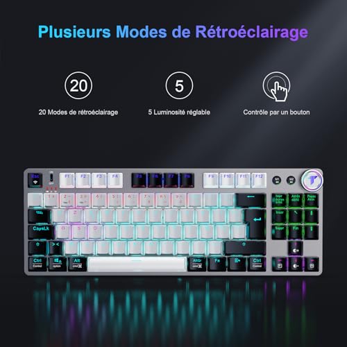 Clavier Mécanique TKL : Clavier gamer Rétroéclairés LED propose 20 modes d’éclairage avec 5 niveaux de luminosité réglables. Vous pouvez utiliser le bouton marche/arrêt ou les touches de raccourci pour l’ajuster à votre convenance (La couleur ne peut pas être modifiée) afin de créer une atmosphère de jeu agréable