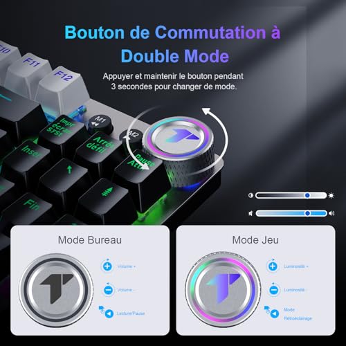 Clavier Gaming Mécanique et Clavier Sans Fil: Clavier mécanique azerty est doté d’un bouton rotatif à double mode. Appuyez sur ce bouton et maintenez-le enfoncé pendant 3 secondes pour passer du mode bureau au mode jeu, et le bouton rotatif vous permet de régler l’éclairage ou le volume