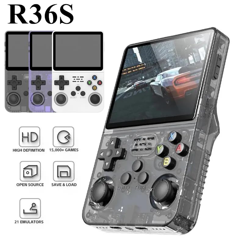 【R36S Console Portable】Console rétro avec écran IPS HD 3.5 pouces (640×480), CPU RK3326 1.5GHz, système Linux open source 64 bits, idéale pour les jeux rétro. 【Compatibilité étendue】Supporte plus de 15 000 jeux et de nombreux émulateurs. Touches L/R à ressort et design ergonomique pour une prise en main confortable. 【Joysticks doubles & OTG】Double joystick pour s’adapter à différents jeux. Connexion OTG pour jouer à deux grâce à un câble adaptateur. 【Performance optimale】Équipée de la puce PK3326, elle gère parfaitement les jeux 2D et certains 3D. 【Batterie longue durée】Batterie 3500 mAh offrant jusqu’à 4 heures de jeu continu avec charge sécurisée.