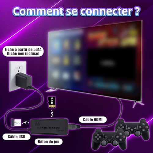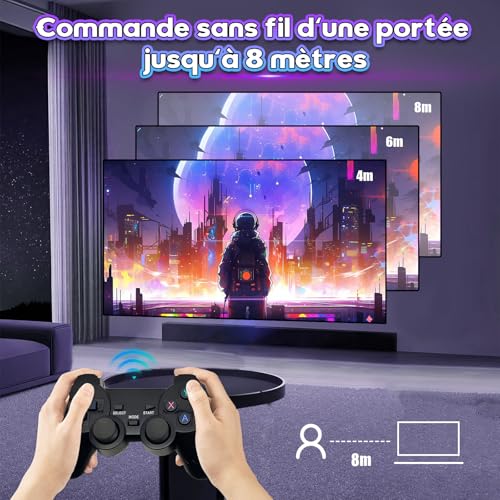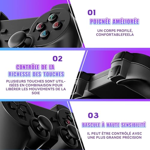 Manettes Sans Fil 2.4G & Double Joysticks 3D : Cette clé TV rétro de jeux comprend deux manettes sans fil 2.4G – plus de câbles emmêlés, juste la liberté du sans-fil. Partagez instantanément le plaisir avec des amis ou la famille pour du jeu en coopération ou des batailles excitantes. Les double joysticks 3D, au design ergonomique, offrent une prise en main confortable, restant fidèles à la sensation classique et restaurant la nostalgie tactile (piles AAA non incluses)