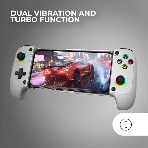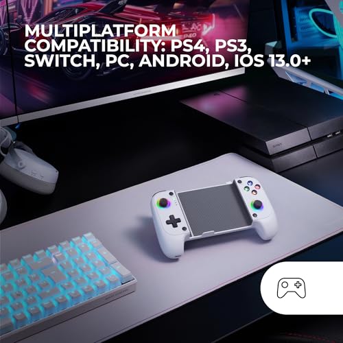 MGPX, Manette Bluetooth 5.0 2en1, RGB Neon, Double Vibration et Fonction Turbo, Support Smartphone jusqu’à 6.8″, Manette Multifonction Compatible PC, Android, iOS et Consoles, USB-C,Blanc