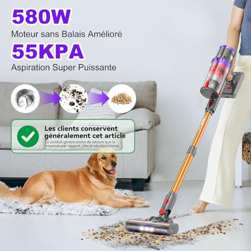 coovy SU7 Aspirateur Balai sans Fil 580W/55Kpa/75Mins, Aspirateur sans Fil Puissant, Chargement Mural, Écrans Tactiles LED, 1,3L Capacité, pour Sols Durs/Tapis/Les Poils d’animaux